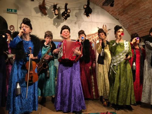 Le Pipistrelle inmitten der Marktstände auf dem Samstagsmarkt von Bellinzona bei gutgelaunten Zuhörer*innen